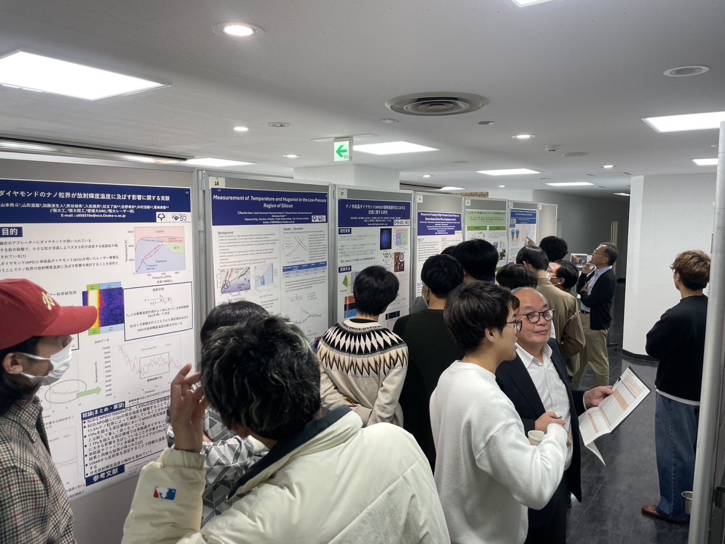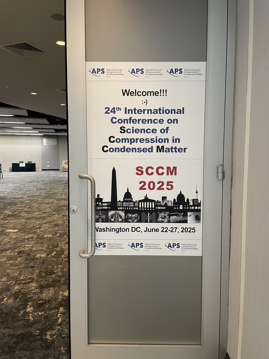 「6月22日から27日にかけて、ワシントンD.C.のワシントンヒルトンホテルで行われたAPS SCCM Meeting 2025: 24th International Conference on the Science of Compression in Condensed Matterに参加しました。私は、初日に"Laser-driven reverberation shock experiments on diamond"のタイトルでポスター発表を行い、低エントロピー圧縮下でのダイヤモンドの物性について報告を行いました。発表には同じくダイヤモンドや低エントロピー圧縮に関する研究者が聴きに来てくださり、つたない英語ながらも有意義な議論ができたと思います。また、レーザーショック実験やシミュレーション研究だけでなく、静圧縮に関する最先端の発表も聴くことができ、とても意義のある会議となりました。