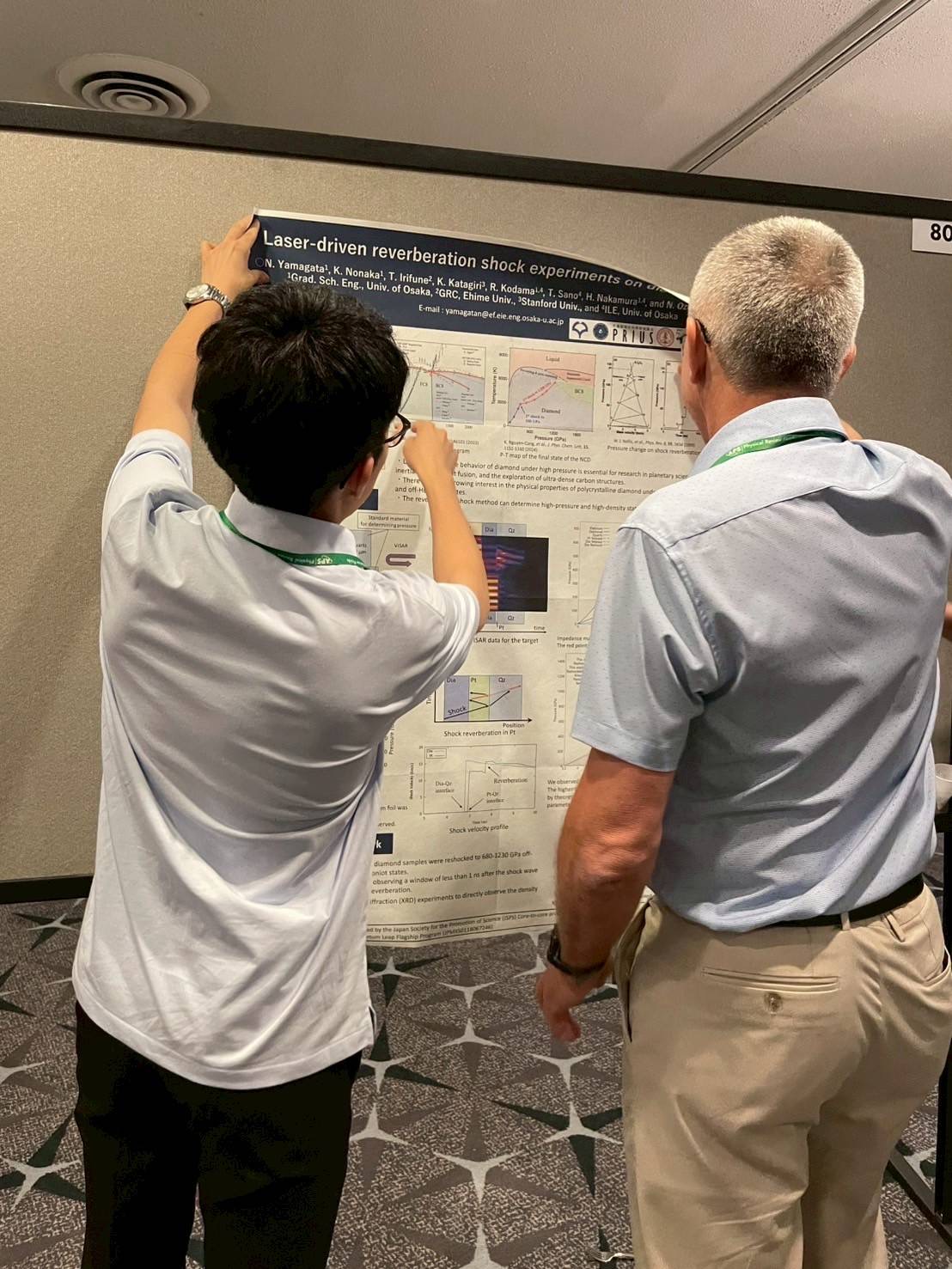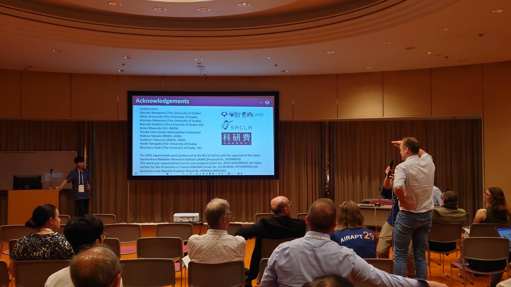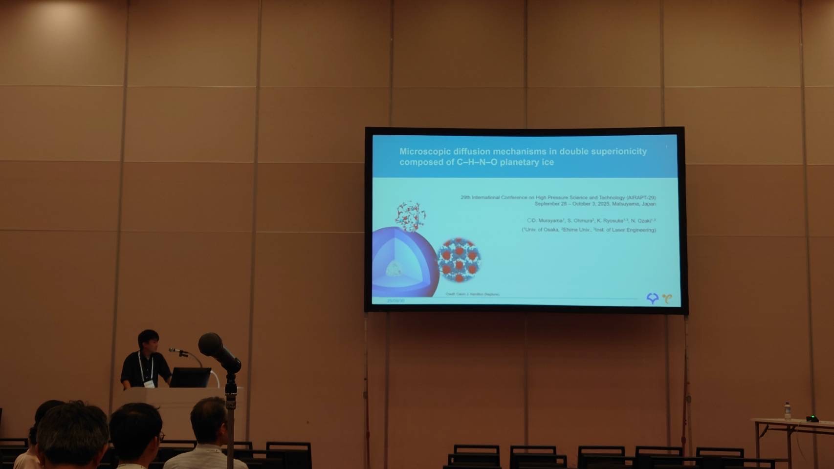 「9月29日から10月3日にかけて、松山で行われたAIRAPT-29に参加しました。私は2日目に"Measuring off-Hugoniot states of diamond based on reverberation shock method"のタイトルでポスター発表を行い、低エントロピー圧縮下でのダイヤモンドの密度や熱圧力などの物性について報告を行いました。同じダイヤモンドの物性を研究しているDr. L. SunやDr. A. E. Lazickiなど様々な研究者からコメント等をいただき、とても有意義な議論ができました。また、この発表でポスター賞を授賞することができました。諸先生方の日頃のご指導と、同輩の皆さんのご協力にあらためて感謝いたします。