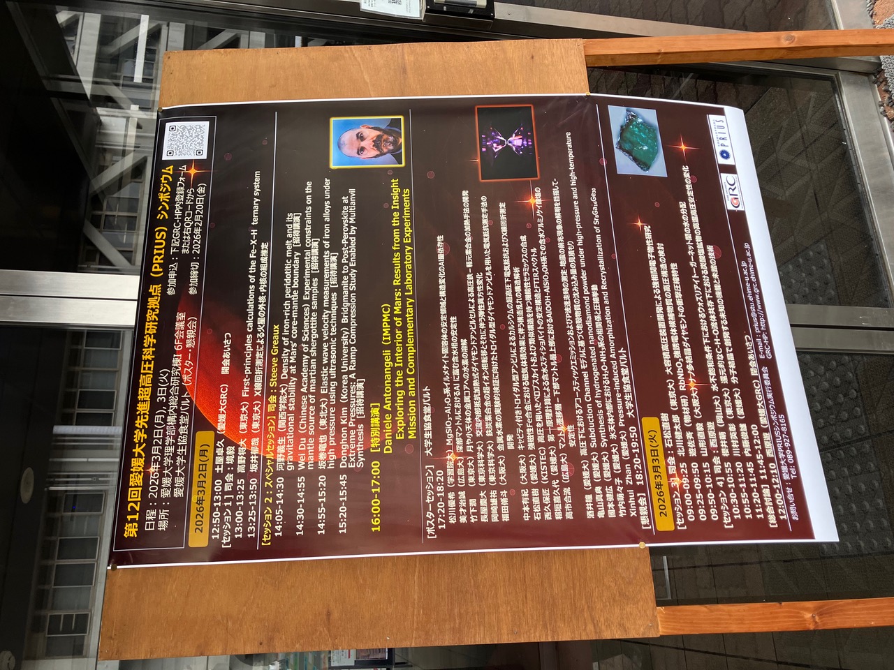 3月2日、3日の2日間にかけて愛媛大学にて開催された第12回愛媛大学先進超高圧科学研究拠点(PRIUS)シンポジウムに、兒玉研からM2山形が参加しました。以下、コメントです。