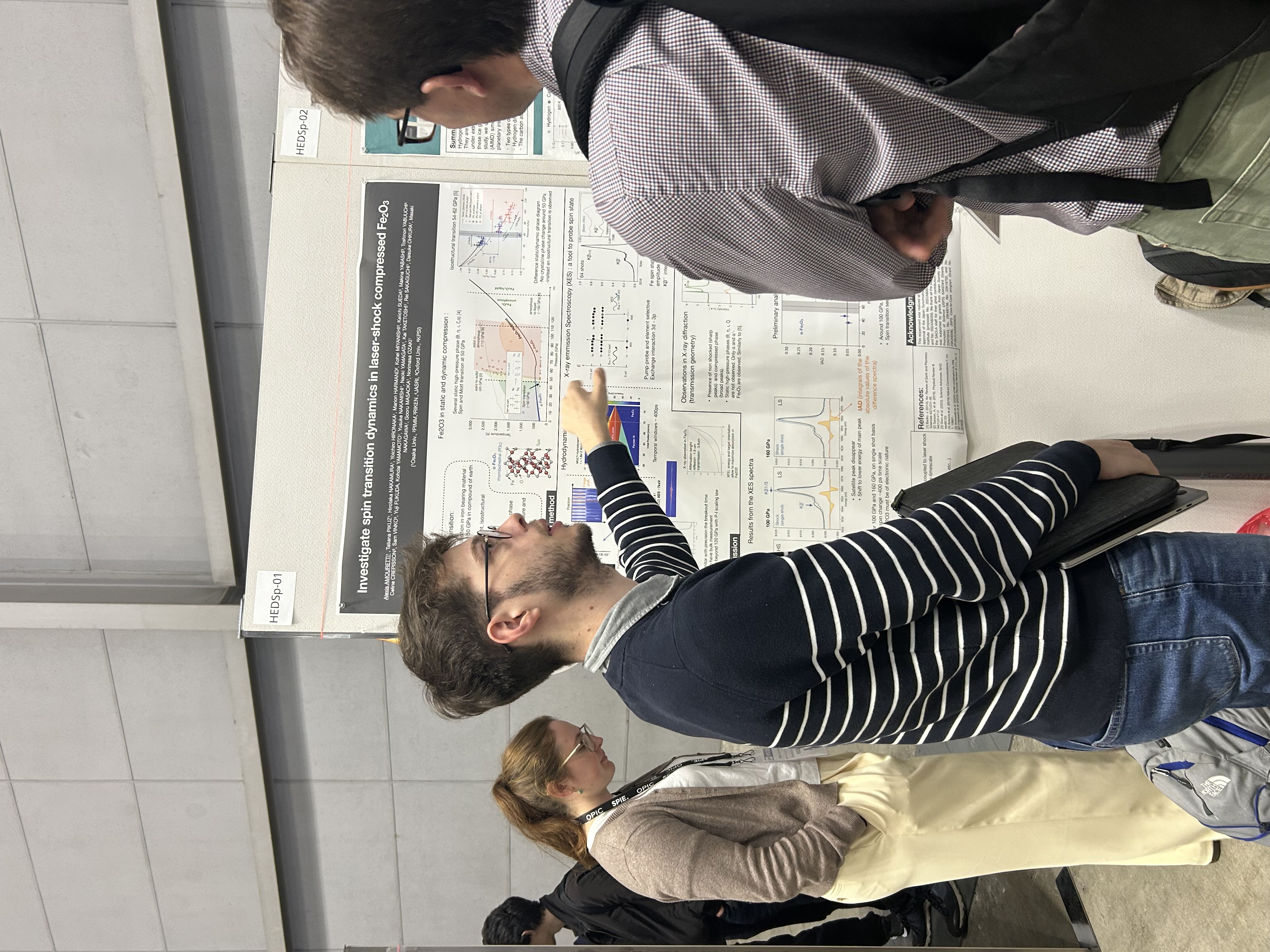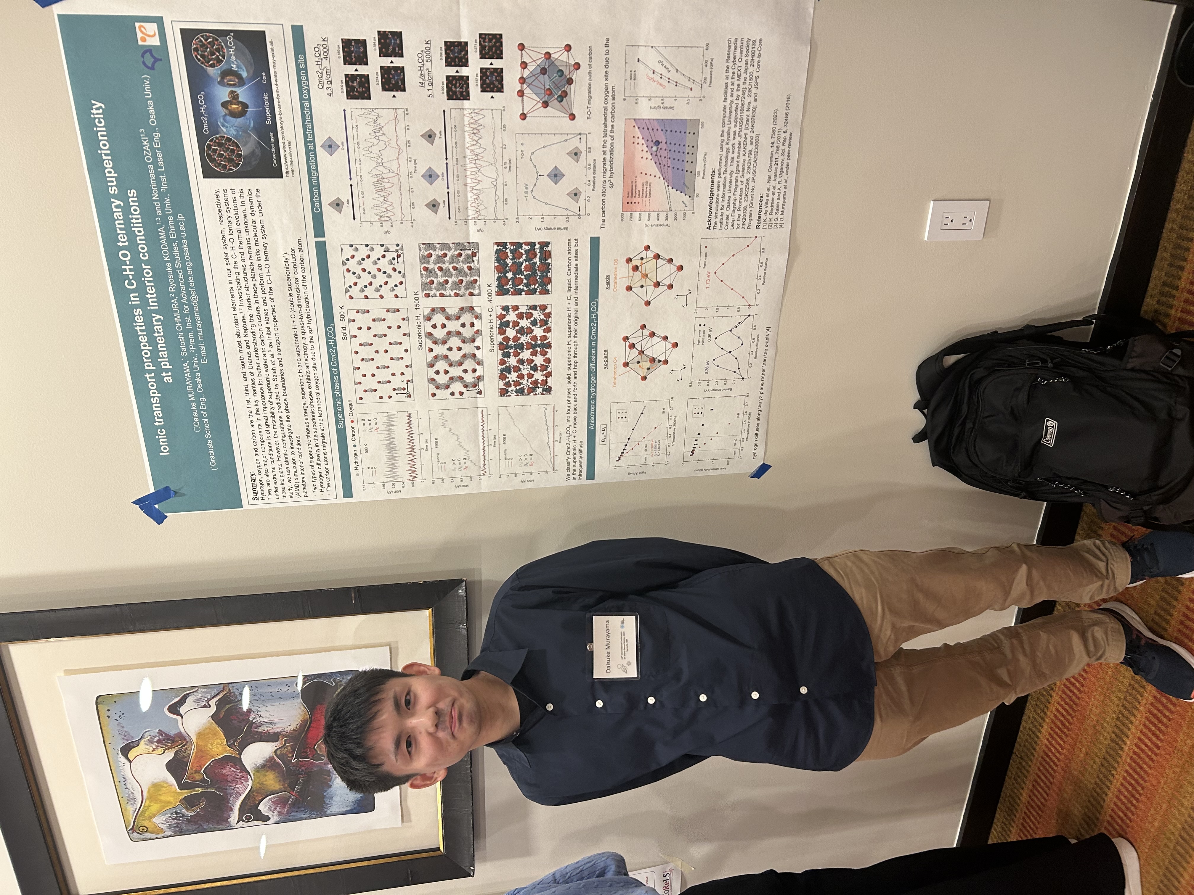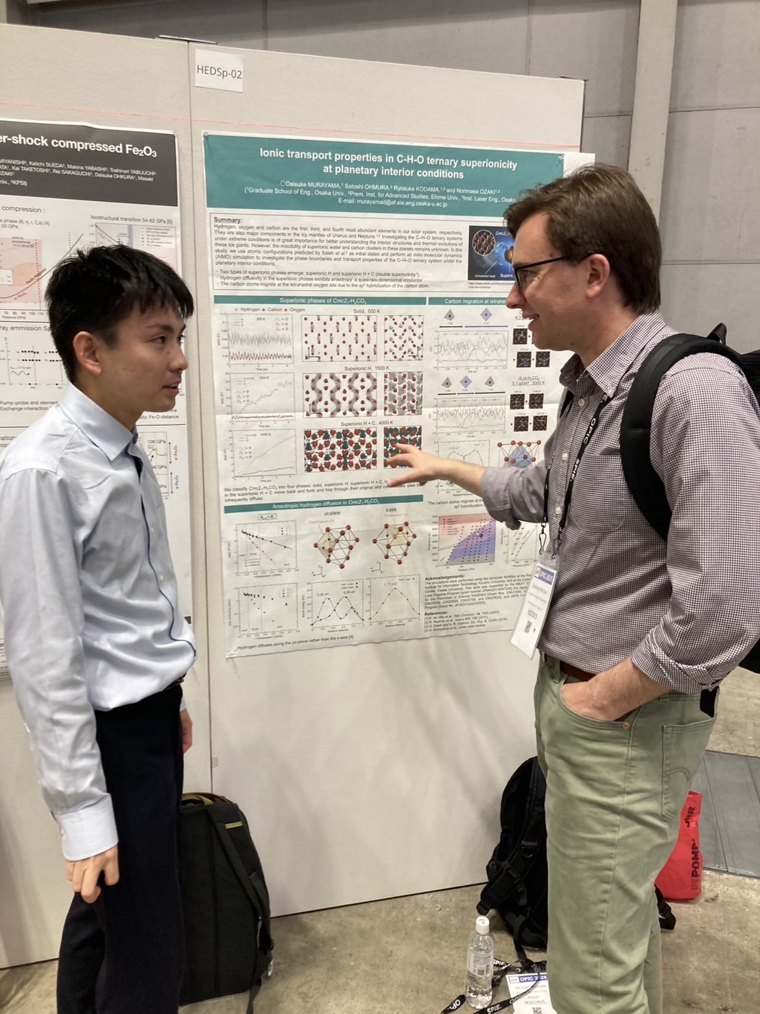 「4/21(月)から4/25(金)にかけてパシフィコ横浜でOPIC2024が行われ、HEDS2024グループとして参加しました。この国際会議は、高エネルギー密度科学に関する内容になります。私は、”Ab initio molecular dynamics simulations of CH4 and H2S mixture at planetary interior conditions”のタイトルでポスター発表を行いました。この研究結果は、低圧と高圧で硫化水素のメタンに対する効果が逆転するということを示しています。ポスター発表時には、時間依存の密度半関数理論を用いてグラフェンとX線の相互作用を調べるという研究発表を聞くことができました。他分野に対する理解を深めることができ、有意義な会議となりました。」