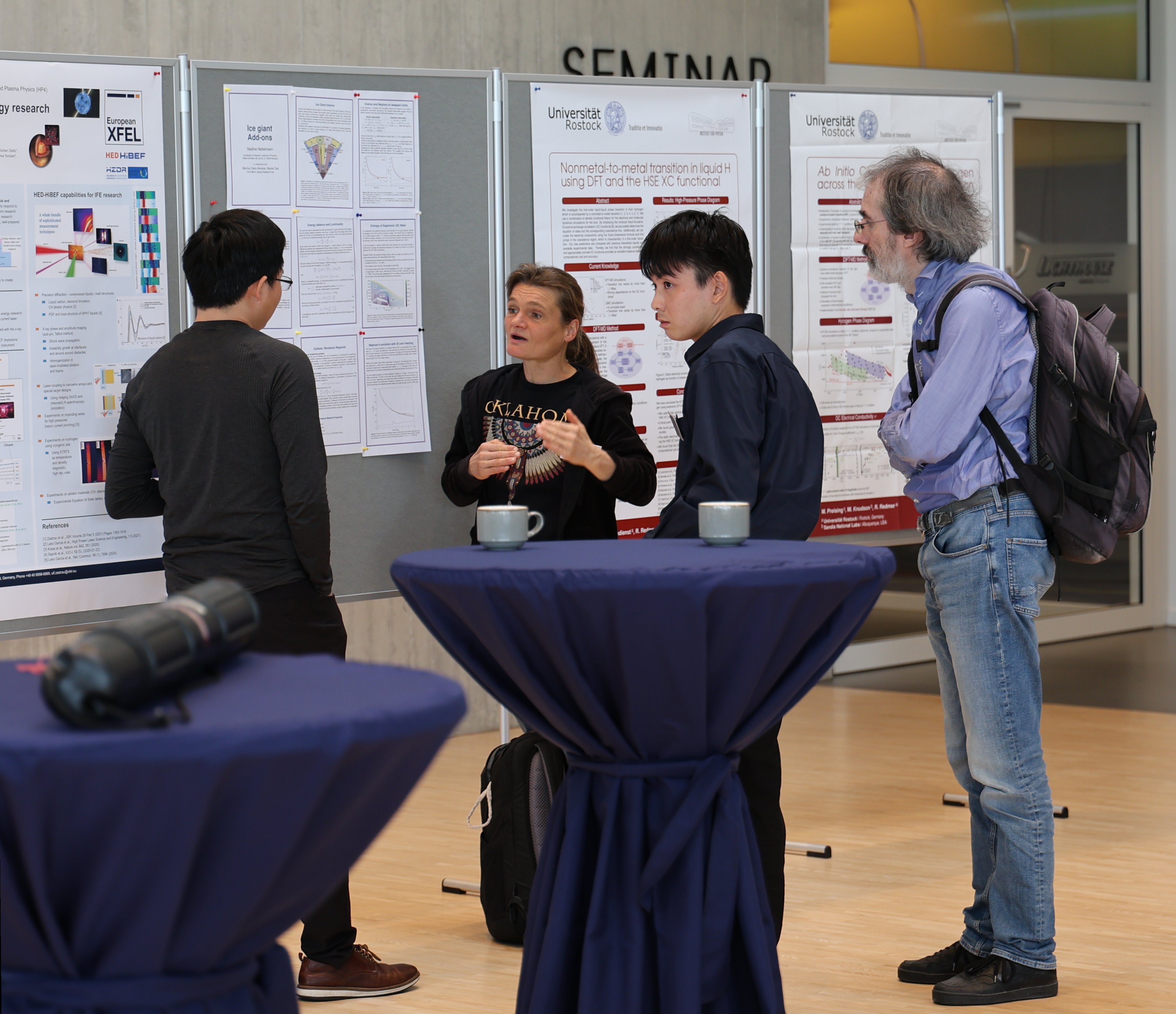 「9/22(月)から9/24(水)にかけて、ドイツ・ハンブルクのEuropean XFELで12th Joint Workshop on High Pressure, Planetary and Plasma Physics (HP4)が開催されました。本ワークショップは、核融合科学、惑星や系外惑星、白色矮星などの天体内部の理解を目的とした研究分野に関する成果を共有する場です。私は、”Superionicity of C–H–O ternary system with ab initio molecular dynamics simulations”のタイトルで招待講演を行いました。この研究結果は長きにわたる査読期間を経ておりまだ採択はされていませんが、数千K、数百GPaという極限環境下で起こるCHO 3元系の超イオン伝導体中を拡散する水素及び炭素の微視的な描像を明らかにした内容になります。参加者の半分以上が計算を専門としており、解答に困るような難しい質問がいくつか来ました。また、ポスター発表時には、氷惑星の分野で著名なDr. N. Nettelmannと議論する機会も得ました。」