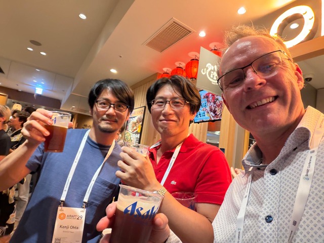 9月29日からの5日間、愛媛県松山にて「AIRAPT-29」が開催され、研究室からD3村山、M2竹歳・山形、M1加藤・藤田が参加しました。授賞式においてはM2山形がポスター賞を受賞しました。全員が発表を終えた日の夜に食べた寿司が美味しかったです。以下、コメントです。