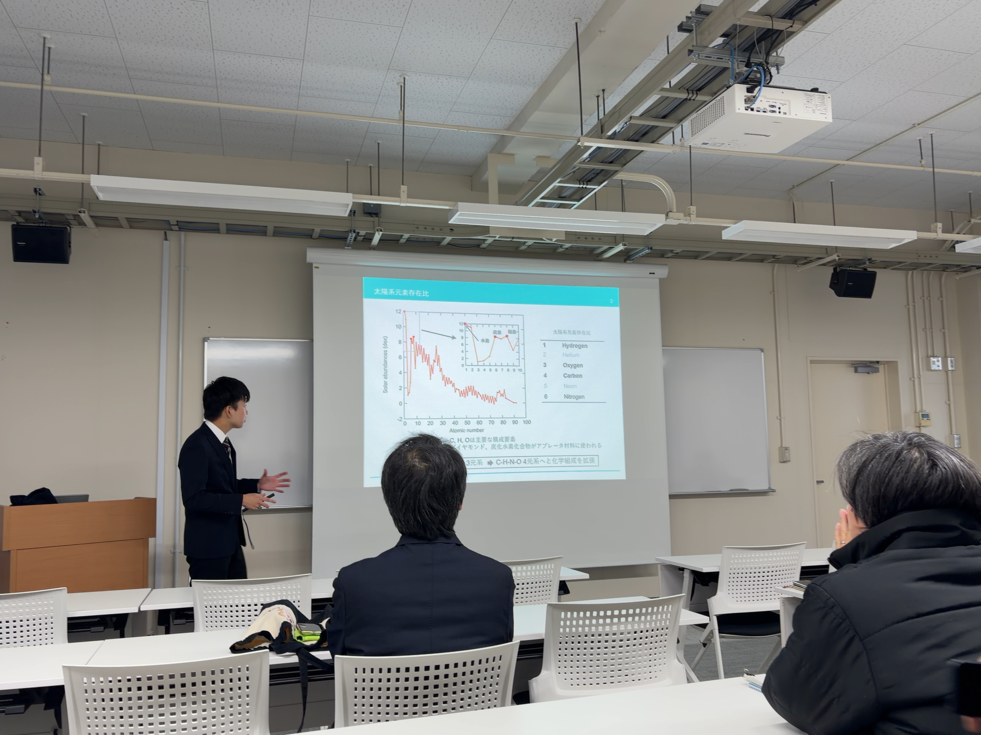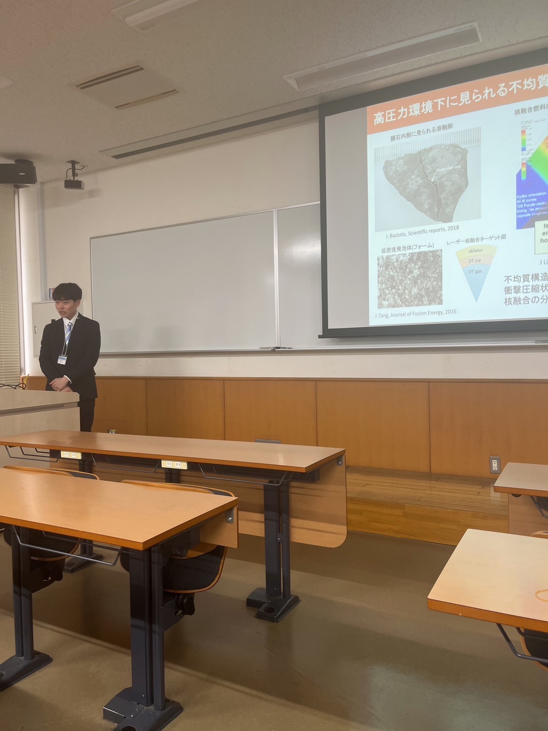 「「ナノ多結晶ダイヤモンドの衝撃圧縮特性」というタイトルで口頭発表を行いました。この研究は愛媛大との共同研究によるもので、衝撃圧縮下のナノ多結晶体と単結晶体のダイヤモンドの密度や温度の違いを調べることで、メゾスケール構造が圧縮特性にどのような影響を及ぼすかを示した研究になります。発表後も様々な方から質問をいただき、多くの方に興味を持っていただけたということをうれしく思います。また今回のPRIUSシンポジウムでは、火星の内部構造を調査する国際プロジェクトInsight missionの調査結果が多く発表されており、とても興味深い講演を聞くことができました。」